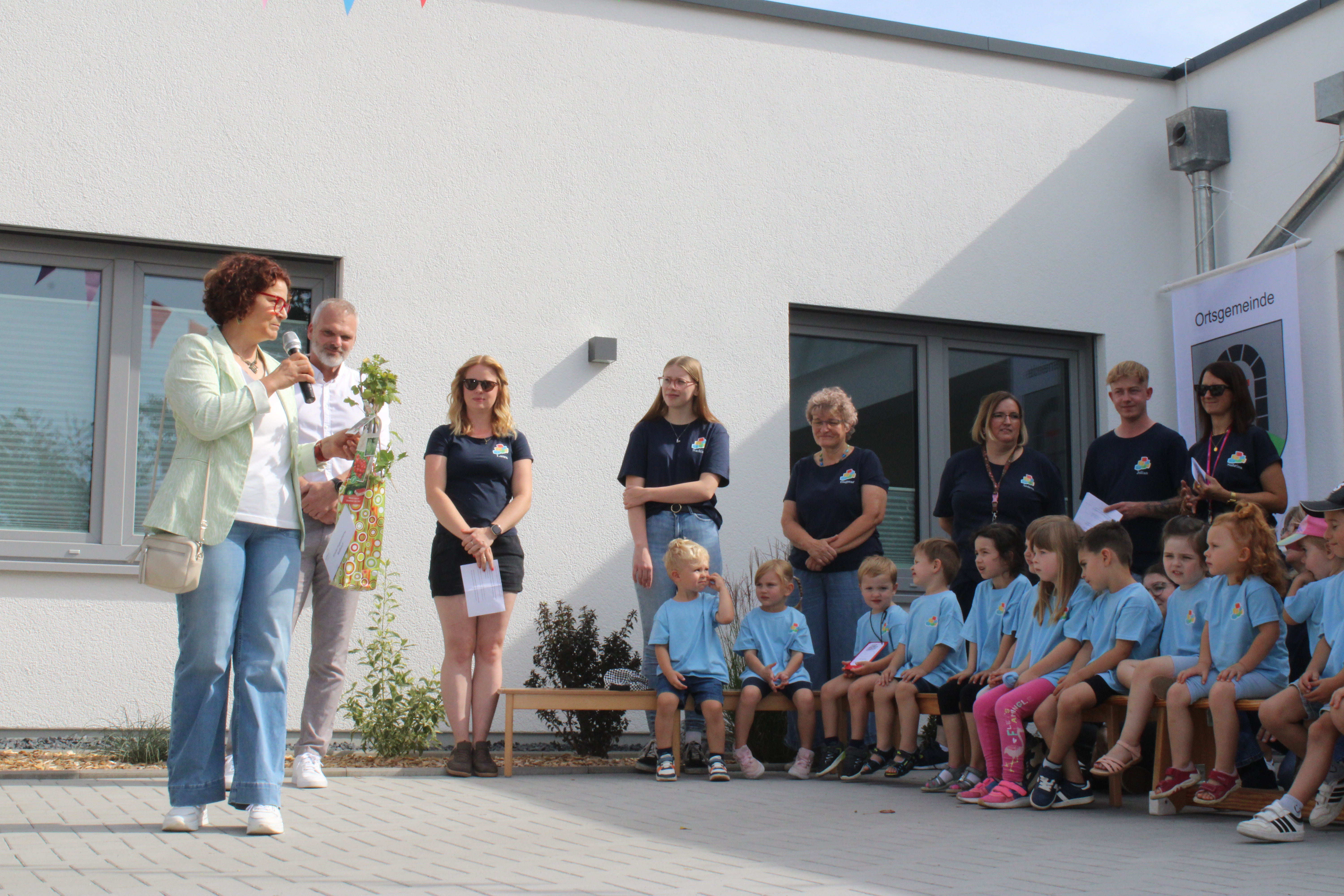 ac5213d1-e32e-43e4-b32c-2fa3234c1b4bDie Kinder warteten schon aufgeregt auf ihren Auftritt, als die Verbandsbürgermeisterin Gabriele Greis ihre Glückwünsche zum Jubiläum aussprach. Dann war es soweit, die Kids hatten ihren großen Auftritt. Nach großem Applaus folgte eine Rede des ehemaligen Ortsbürgermeisters Wilfried Oettgen, der 24 der 25 Jahre Träger des Kindergartens gewesen ist. Er nahm Bezug auf die geschichtliche Entwicklung des Kindergartens, das Motto während der gesamten 25 Jahre lautet: „Für unsere Kinder ist das Beste gerade gut genug“. Über das letzte Jahr, die Baumaßnahmen und die Weiterentwicklung der Einrichtung wurde durch den Ortsbürgermeister informiert. Danach erfolgte die Re-Zertifizierung des Integrierten-Management-Systems durch die IBE Gieleroth, ein großes Lob an das ganze Kita-Team, die während der Bauarbeiten das Qualitätsmanagement weiter voran getrieben und alle Auflagen mit Bravour gemeistert haben. Nach dem offiziellen Teil kamen die Kinder mit einem Aufgabenpacour, Hüpfburg und Kino mit Popcorn auf ihre Kosten. Durch den Elternbeirat wurde eine große Tombola mit über 300 Preisen organisiert. Bei Kaffee und Kuchen, Pommes und Currywurst und kühlen Getränken konnten es sich die Gäste gut gehen lassen.